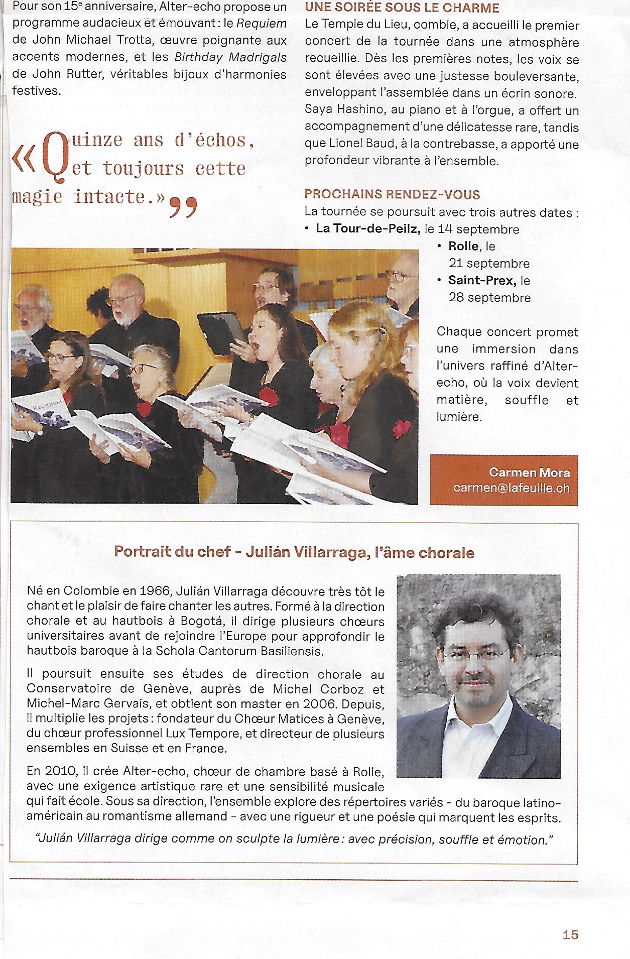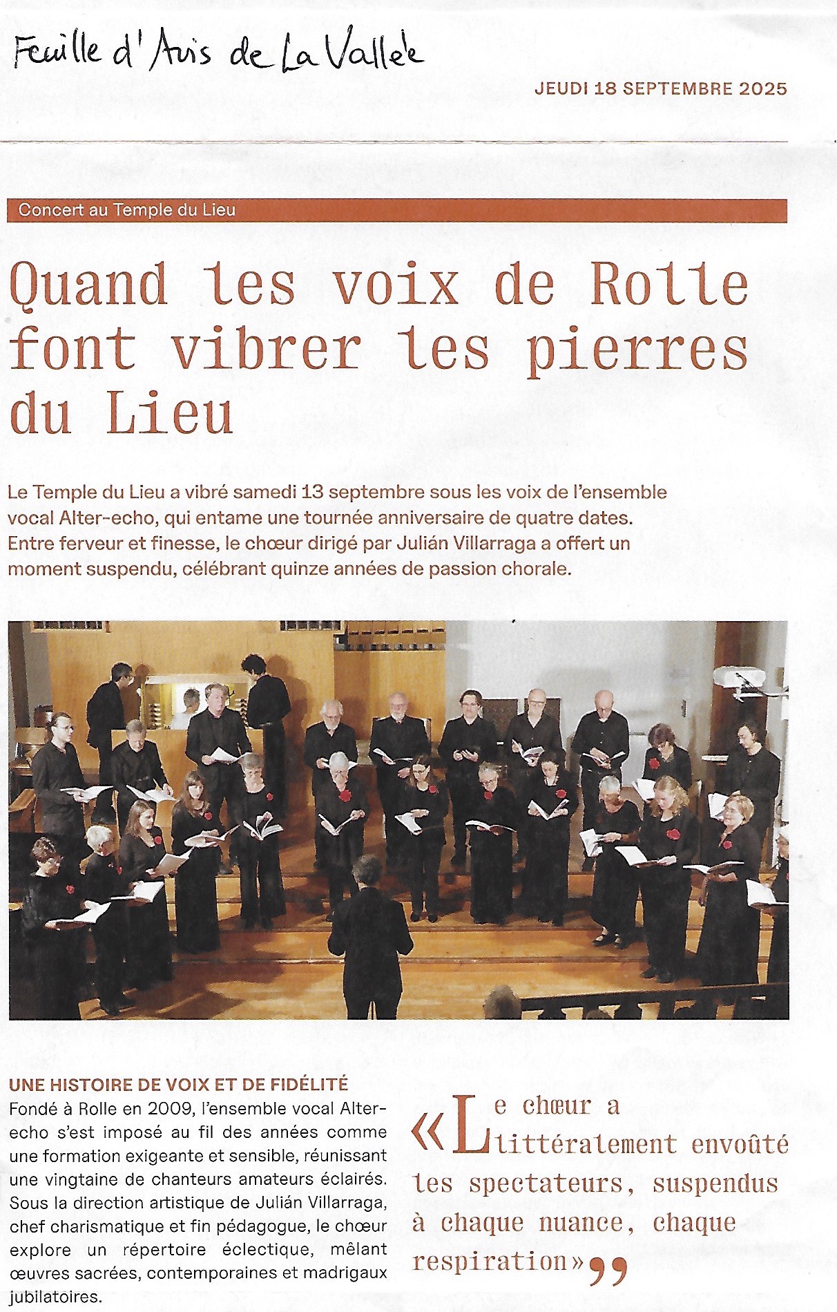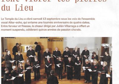 En 2025, l’ensemble vocal alter-echo a fêté son 15ᵉ anniversaire avec un programme exceptionnel. Les deux œuvres choisies ont permis non seulement de créer un pont entre tradition et modernité — fidèle à notre approche du répertoire choral — mais aussi de célébrer la vie sous toutes ses formes, de la naissance à la mort. Le dialogue entre le Requiem et les Madrigaux d’anniversaire a ainsi pris tout son sens, tant sur le plan thématique que musical.